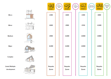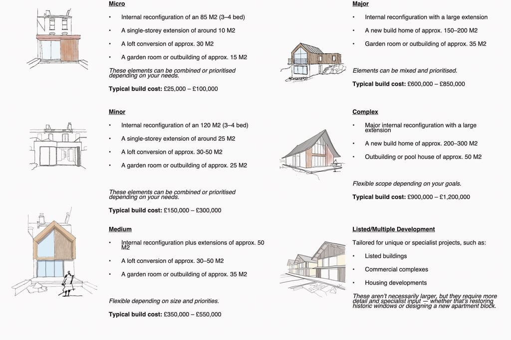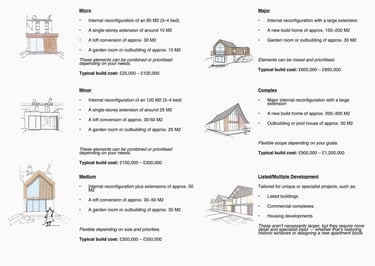 Our comprehensive services are delivered through four distinct stages, designed to offer you the flexibility to select the level of support best suited to your project's unique requirements. Each stage is clearly defined with a detailed list of deliverables, accompanied by a transparent, fixed pricing structure outlined below unlike other design professionals that will quote on percentage of build costs. This approach ensures clarity and confidence in the value and quality of the services you are receiving.