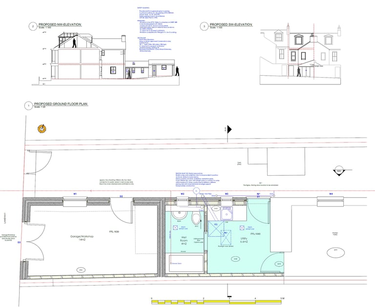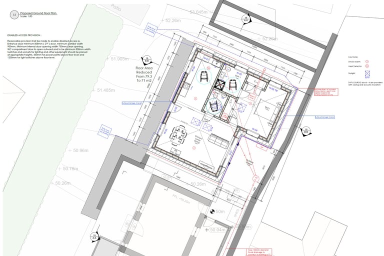Proposed floor plans illustrating wall construction, escape routes, surface and foul water disposal, access requirements, and structural information.