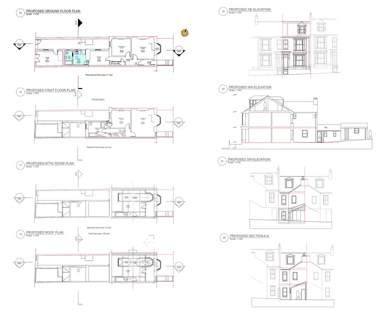 block & roof plan, floor plans, Elevations & sections